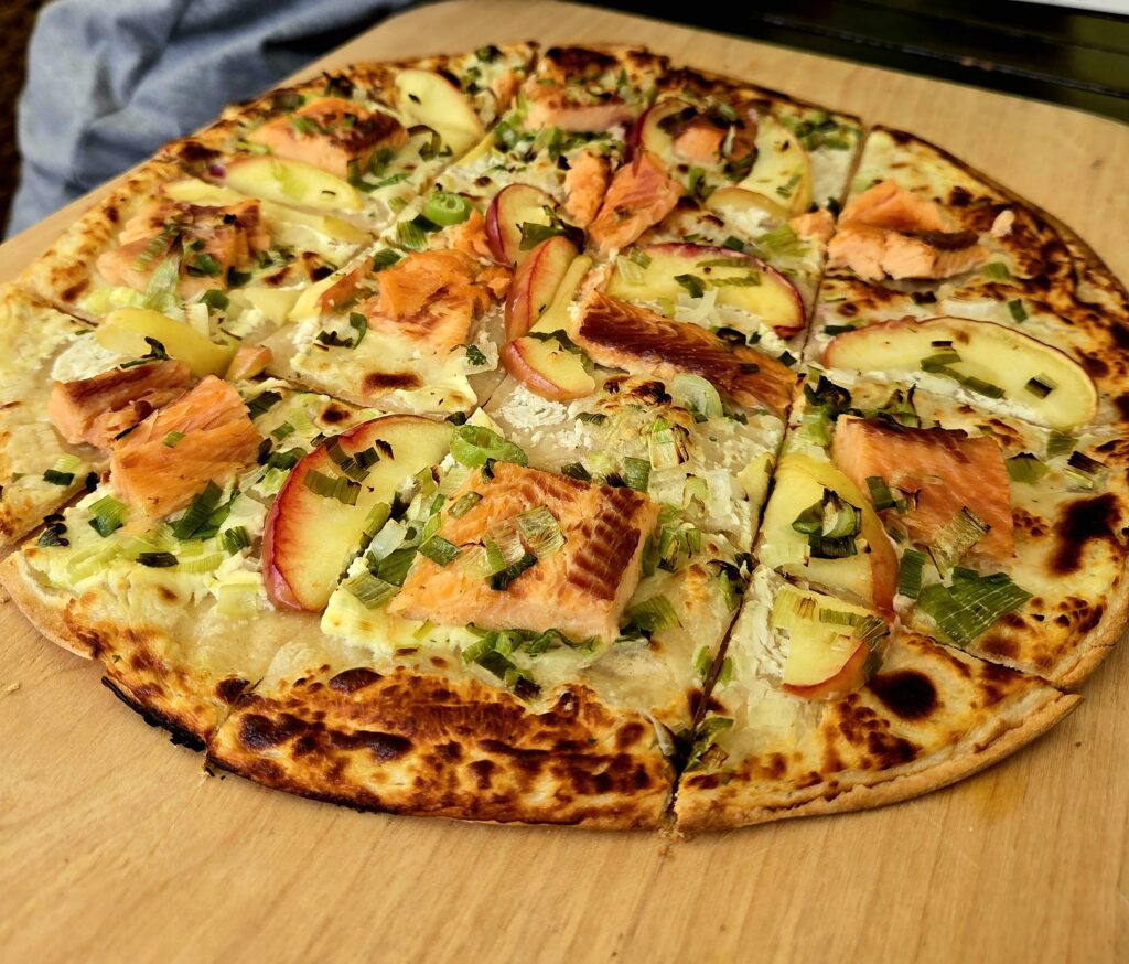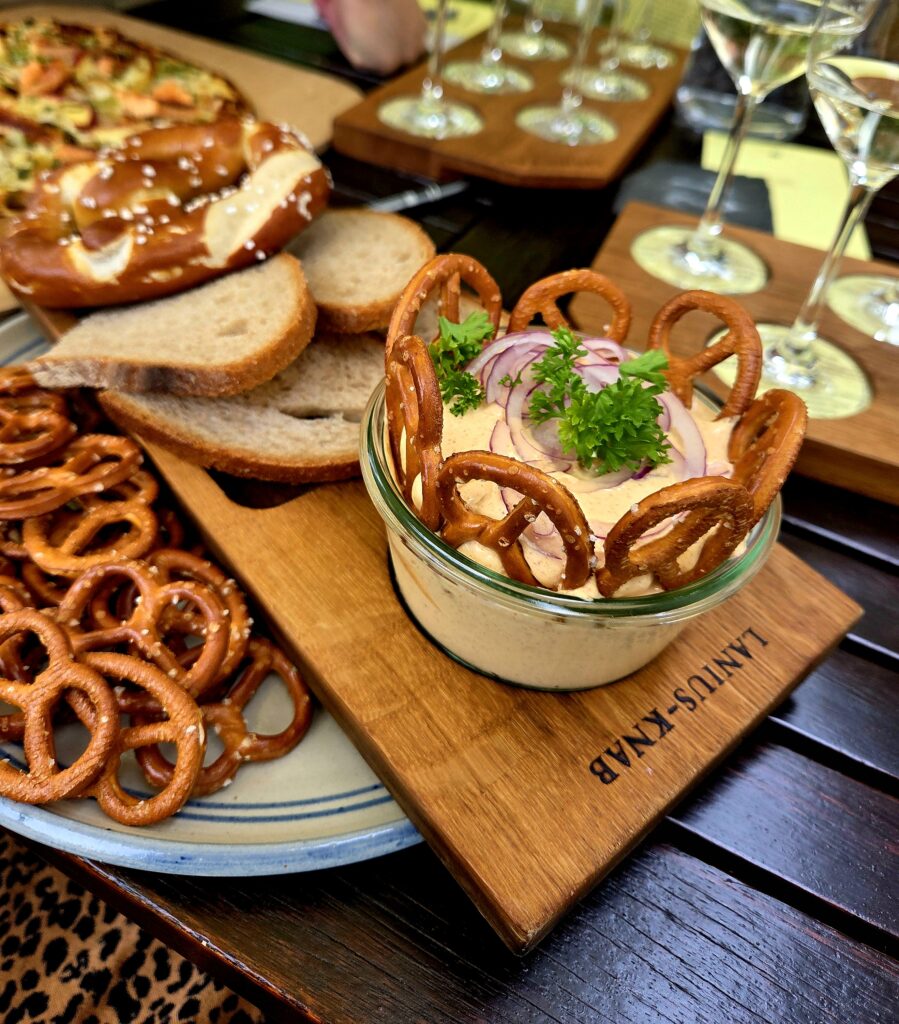 Of course with our wine we had some delicious food to pair with it! We ordered the Flammkuchen, composed of bread dough rolled out very thinly in the shape of a rectangle or oval, which is covered with fromage blanc or crème fraîche. The one we ordered had local smoked trout, apple, and spring onions. It was very tasty and all the ingredients meshed well together. We also ordered the Spundekäs, with pretzel and bread. This a traditional cheese spread from the Rhine region made with cream cheese, quark, and paprika. It was smooth and tangy, paired nicely with the bread and pretzel!