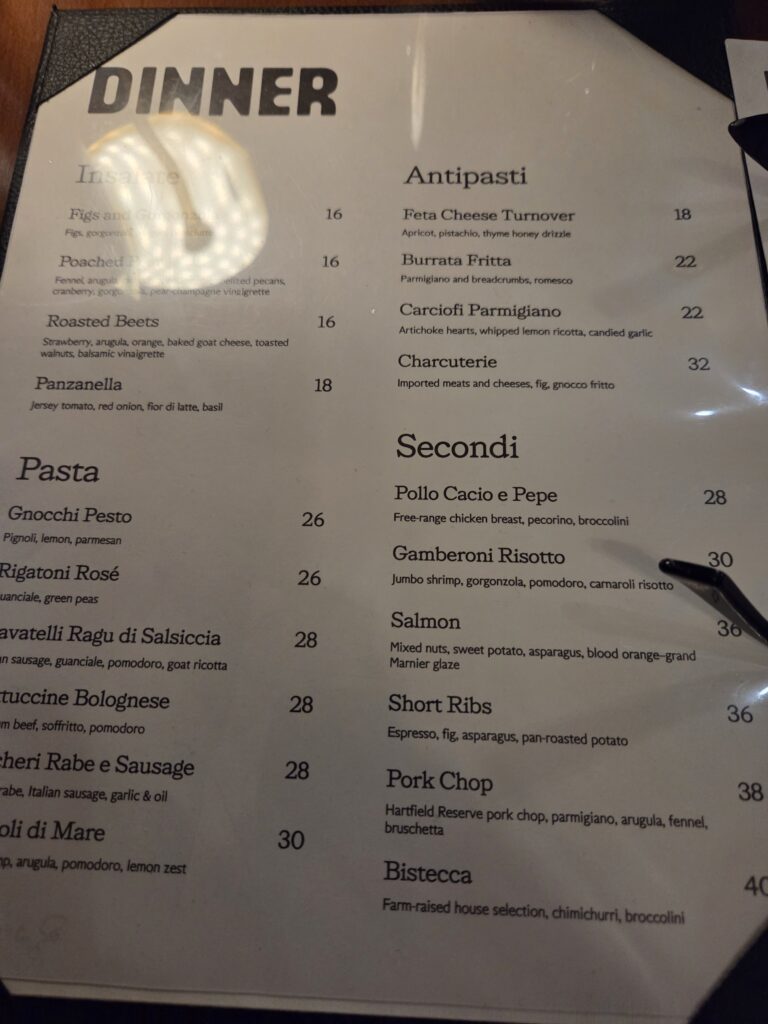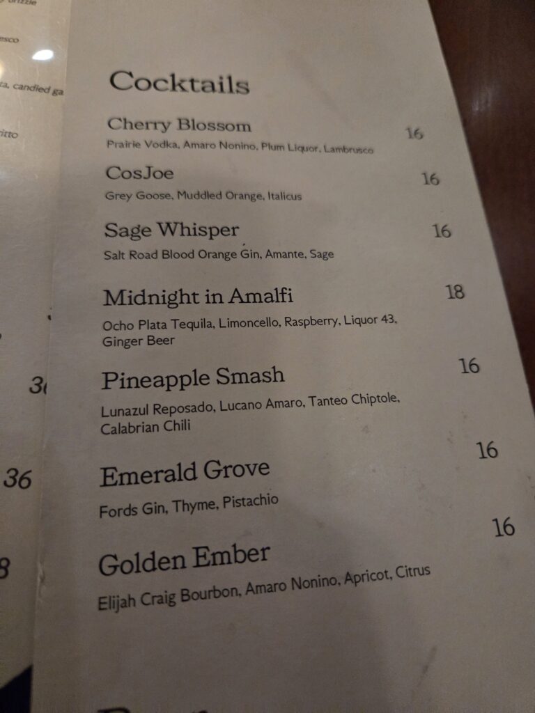 Q Kola (best way to explain it as a natural coke) made from with agave, Kola nut, clove, and vanilla.HOUSE-CURED BRESAOLA mustard greens, shaved Sarvecchio cheese, lemonSQUASH BLOSSOM PICCATA anchovy, garlic, lemon, caper, Sarvecchio cheese