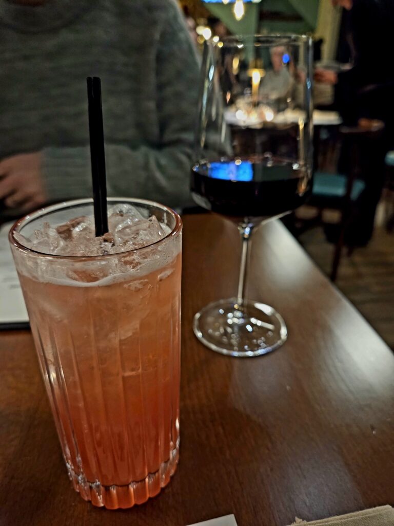 Hubby’s mocktail…ALMOND FIZZ cranberry juice, pineapple juice, orgeat syrup, lemon, gingerANCHOR & PORT mijenta reposado tequila, chai, sweet vermouth, lemonPea soup- a complimentary starter GOLDEN BEET SALAD goat cheese brulee, kale, red beet puree, pistachio pesto, jamon iberico