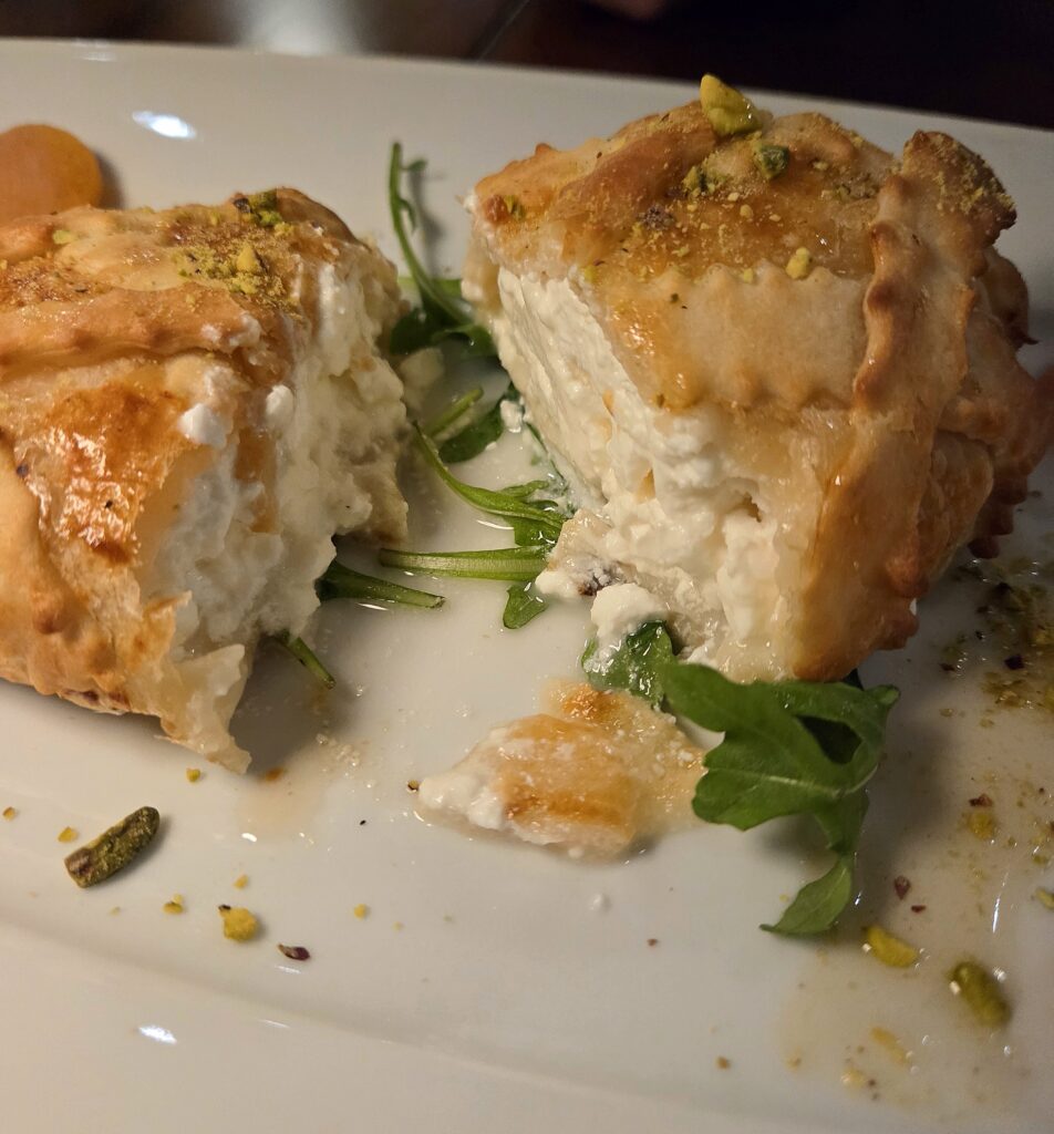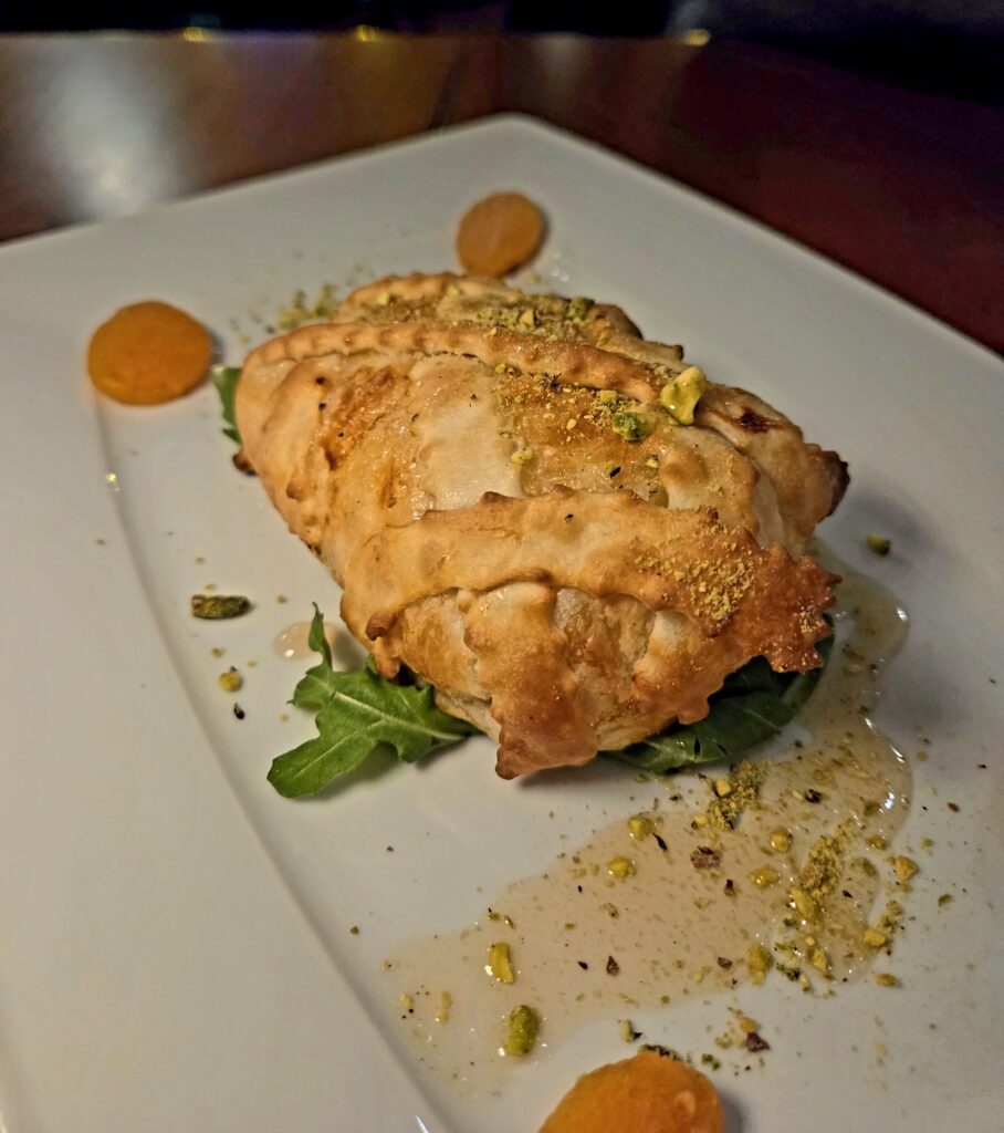 Lets start with drinks and the appetizer. My husband ordered a cabernet, (which was very good), but I wanted to try one of their cocktails. Per recommendation from our server, I ordered the “Midnight in Amalfi.” This is made of Ocho Plata Tequila, Limoncella, Raspberry, Liquor 43, and Ginger Beer. Refreshing and not over the top sweet. This drink definitely made me feel like I was on the Amalfi coast of Italy. We then ordered our appetizer, the Feta Cheese Turnover. The Turnover is made of apricot, pistachio, thyme and a honey drizzle. I loved the gold crust of the puff pastry! It was also airy, and the cheese added a nice richness to the dish. It was a great mixture of savory and sweetness. A great combo!