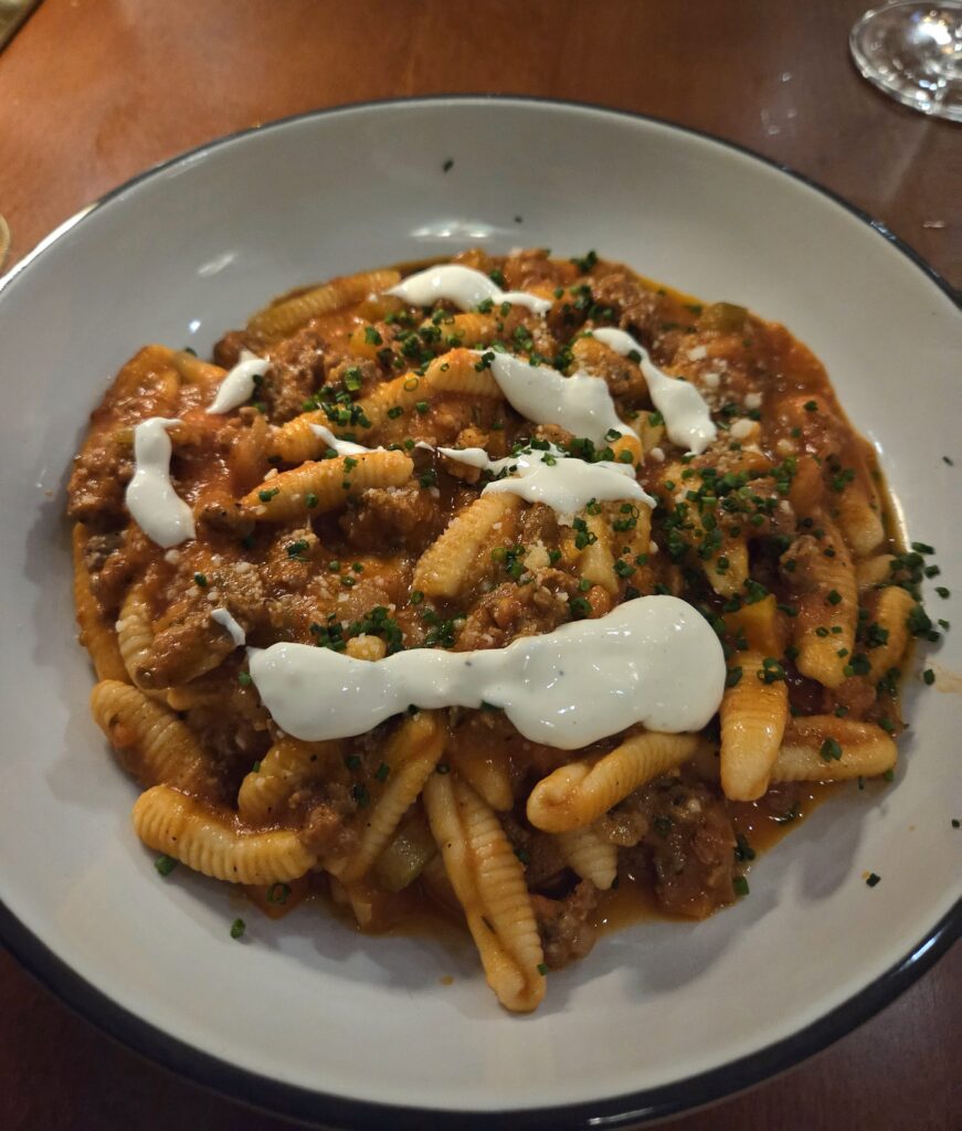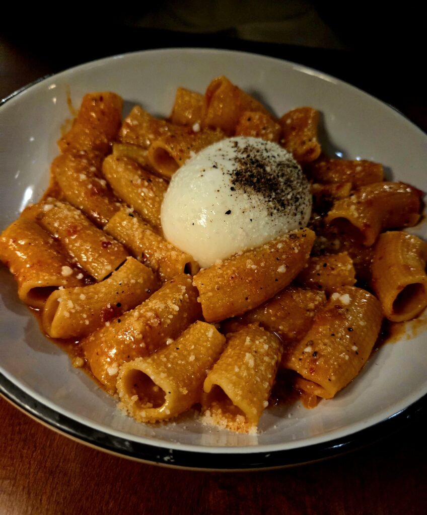 Dinner! I ordered the Cavatelli Ragu Di Salsiccia, which had Italian sausage, guanciale, pomodoro, and goat ricotta. So good! The pasta is made in house (which I’m a huge fan of 😋😋) … great flavor and texture. Loved the sauce and the guanciale provided a nice additional saltiness to the dish (Italian cured pork made from the cheeks of a pig). But the addition of the goat cheese added a nice creaminess and tanginess that balances out the richness of the sausage and guanciale. My husband ordered from the specials… he had the spicy rigatoni (again the pasta was made in house). The sauce was flavorful and had just the right amount of spice. He loved the addition of the burrata! The creamy, buttery center, added a velvety, cooling agent to the spiciness of the dish.